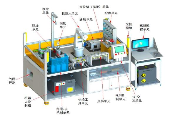 1 、本設(shè)備是工業(yè)機(jī)器人專業(yè)教學(xué)訓(xùn)練綜合實(shí)訓(xùn)設(shè)備采用模塊化配置思路,主要包括機(jī)器人單元、裝配單元、視覺單元、運(yùn)動軌跡單元、碼垛單元、快換工具單元、打磨單元、焊接單元、去毛刺單元、倉庫單元、人機(jī)交互單元、 PLC 單元、離線編程單元、桌面平臺單元以及氣泵等。根據(jù)訓(xùn)練及考核任務(wù),可快速更換不同模塊,實(shí)現(xiàn)不同難度不同技能點(diǎn)的考核。系統(tǒng)深度集 成了離線編程技術(shù),軟件不僅包含硬件平臺的三維模型資源,還大大簡化了涂膠、打磨、 焊接、碼垛等工藝實(shí)現(xiàn)的編程過程、提高軌跡復(fù)現(xiàn)精度、避免發(fā)生碰撞干涉。該工作站不僅滿足了職業(yè)院校不同專業(yè)學(xué)生針對工業(yè)機(jī)器人的操作和編程的教學(xué)需求,任務(wù)源于工業(yè)的特征也使其更加適于作為訓(xùn)考平臺。 平臺展示了工業(yè)自動化智能制造、生產(chǎn)數(shù)字化、控制網(wǎng)絡(luò) 化、系統(tǒng)集成化等思想,涉及智能控制技術(shù)、工業(yè)機(jī)器人技術(shù)、機(jī)電一體化技術(shù)、計算 機(jī)應(yīng)用技術(shù)、軟件技術(shù)、相機(jī)測量技術(shù)等領(lǐng)域的知識和技能。