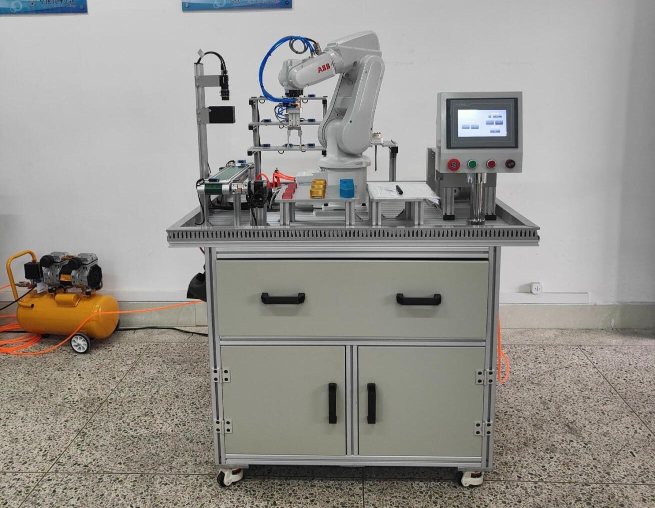 工業(yè)機(jī)器人綜合實訓(xùn)平臺 是專門針對工業(yè)機(jī)器人領(lǐng)域的一套實訓(xùn)實驗教學(xué)系統(tǒng),按照模塊化結(jié)構(gòu)進(jìn)行設(shè)計,主要由六關(guān)節(jié)工業(yè)機(jī)器人、視覺系統(tǒng)、 PLC 模塊、電氣控制系統(tǒng)等組成,可進(jìn)行工業(yè)機(jī)器人相關(guān)技術(shù)開發(fā)、維護(hù)維修、示教等方面專項實訓(xùn)教學(xué),能夠完成關(guān)鍵設(shè)備的特性和參數(shù)設(shè)置、工業(yè)機(jī)器人手動控制及基本參數(shù)設(shè)置、工業(yè)機(jī)器人 IO 通信及 PLC 信息交互、工業(yè)機(jī)器人單軸運動與線性運動控制、工業(yè)機(jī)器人工具 TCP 參數(shù)標(biāo)定、工業(yè)機(jī)器人工件坐標(biāo)系參數(shù)標(biāo)定及多坐標(biāo)系切換、基于關(guān)鍵點的軌跡編程、模擬碼垛工藝應(yīng)用編程、工業(yè)機(jī)器人與 PLC 的通訊與聯(lián)調(diào)、觸摸屏控制應(yīng)用等實訓(xùn)任務(wù)。