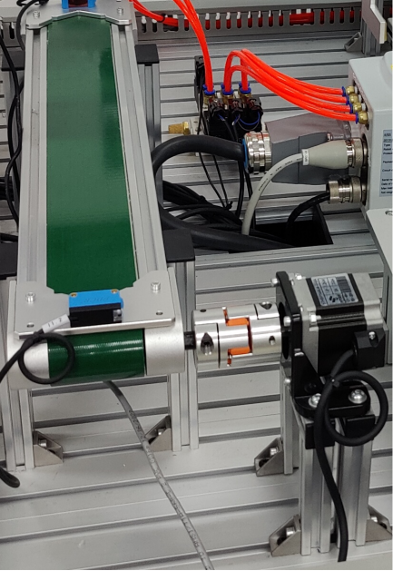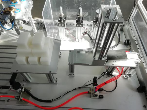 2 碼垛:碼垛是模擬工業(yè)場合的自動搬運碼垛功能設(shè)計,可以自動記錄碼垛位置和高度,具有重復(fù)精度高,自動計算旋轉(zhuǎn)角度等功能;工業(yè)機(jī)器人工具盤上安裝了氣動吸盤;包含一個輸送帶,采用步進(jìn)電機(jī)驅(qū)動;電機(jī)速度可以進(jìn)行調(diào)節(jié);可以實現(xiàn)將模擬物料送到輸送帶上進(jìn)行定向傳送;具有傳感器能夠檢測模擬物料是否到達(dá)指定位置。