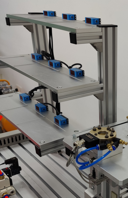 5 立體倉庫:存儲自動裝配工件;倉位數(shù)量:≥ 3 列 3 層 9 個;倉位承重:≥ 2Kg ;倉位尺寸:≥ 100mm × 70mm × 80mm ;外形尺寸:≥ 350mm × 180mm × 450mm ;工件種類:≥ 3 種 9 個;工件模塊包括自動裝配母件、子件等。