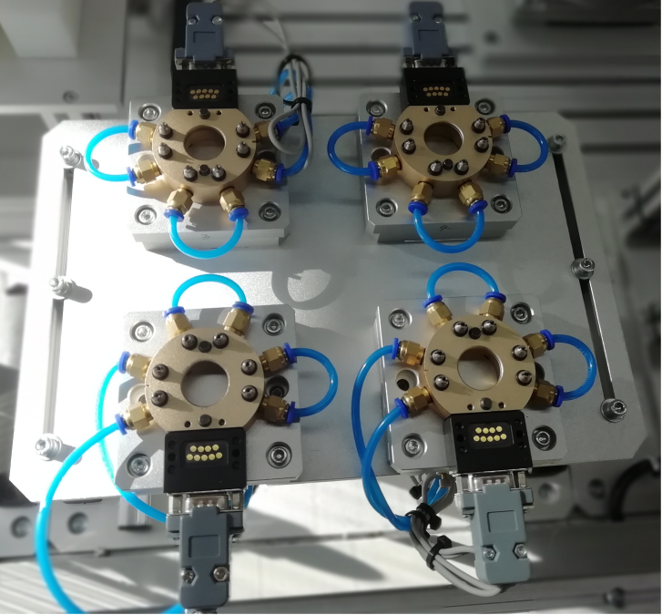 7 快換單元:由 4 種夾具組成,配合機(jī)器人使用作搬運、涂膠、焊接、碼垛等用途。配置快換公頭 1 個、快換母頭 4 個、搬運夾具 2 套、涂膠夾具 1 套、焊接工具 1 套、電磁閥 3 個,并標(biāo)準(zhǔn)固定機(jī)構(gòu),移動式底板。