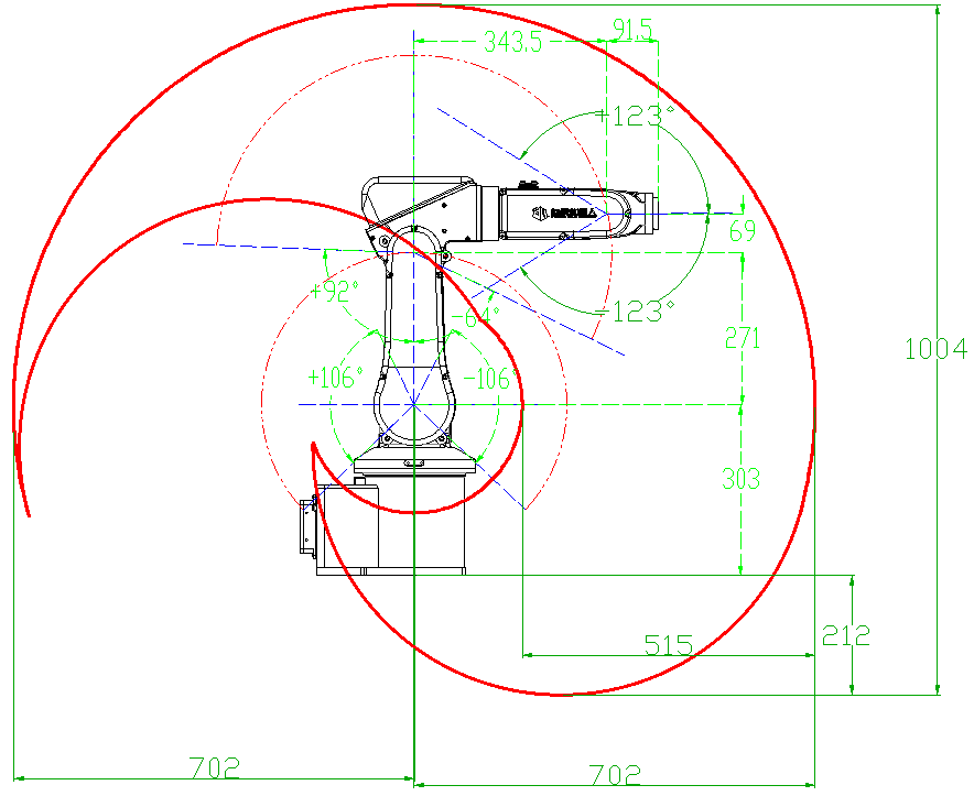 軸數(shù) :6 有效載荷 :4Kg 重復(fù)定位精度:± 0.05mm 安裝方式:任意角度 本體重量 :27Kg 最大運(yùn)動半徑 :702mm 能耗: 1.2KW 運(yùn)動范圍: J1 回轉(zhuǎn): +152 °—— -152 ° J2 回轉(zhuǎn): +106 °—— -106 ° J3 回轉(zhuǎn): +64 °—— -92 ° J4 回轉(zhuǎn): +135 °—— -135 ° J5 回轉(zhuǎn): +152 °—— -152 ° J6 回轉(zhuǎn): +400 °—— -400 ° 電源電壓: AC 220V 50/60HZ |