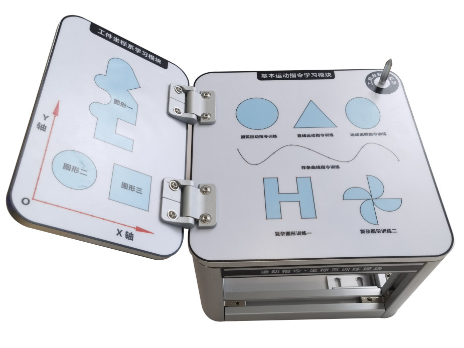 該模塊采用激光描繪圖案,完成圓弧、直線、 B 樣條曲線等基本運(yùn)動指令的訓(xùn)練,同時可借助能任意調(diào)整角度的訓(xùn)練板進(jìn)行工件坐標(biāo)系標(biāo)定訓(xùn)練,此外,模塊還設(shè)置了專用的工具標(biāo)定尖供使用者完成工具坐標(biāo)系的標(biāo)定訓(xùn)練。