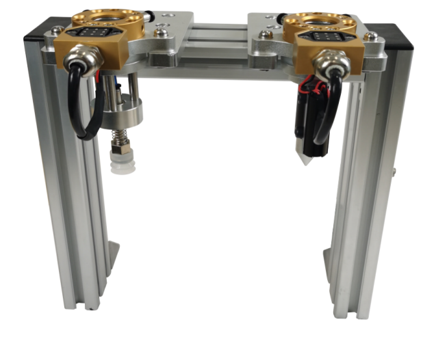 該模塊設(shè)置了兩組末端快換夾具,可供使用者練習(xí)精密的工業(yè)機(jī)器人快換夾具更換操作,學(xué)習(xí)末端快換夾具的機(jī)械、電路及氣路連接原理。