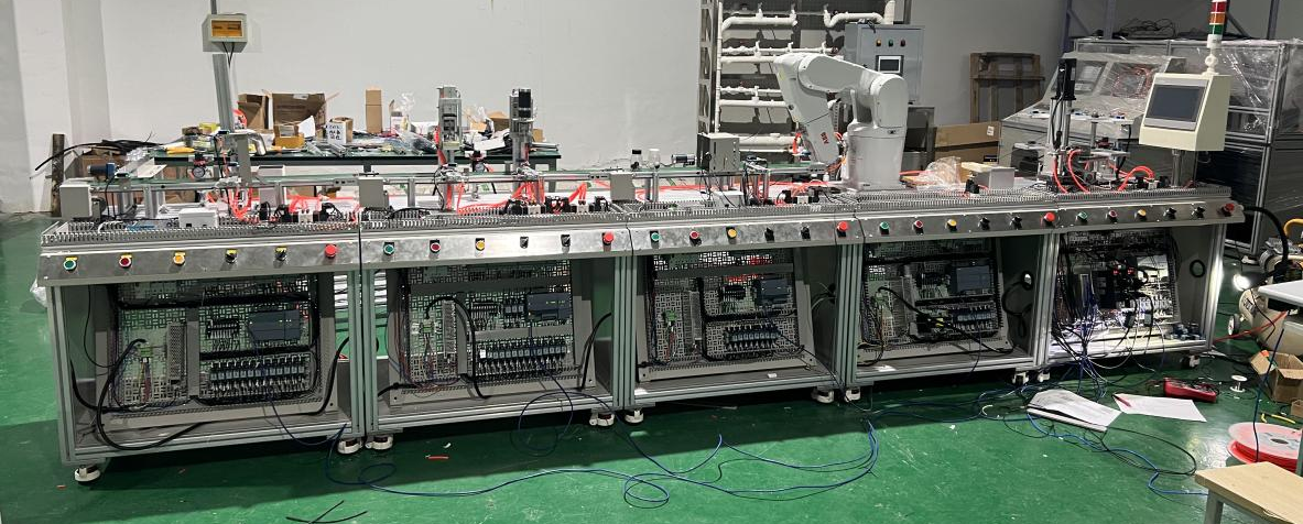 ( 6 )控制系統(tǒng)根據(jù)控制要求布置于萬能網(wǎng)孔控制板或桌面平臺上,配置有 PLC 系統(tǒng),以及與控制要求配套的低壓控制器件??刂泼姘蹇刂瓢粹o采用輕觸式按鍵設(shè)計,設(shè)置有“啟動、停止、復位、單機、聯(lián)機、急停”等控制功能。。