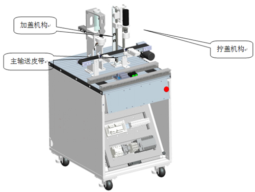 加蓋擰蓋工作站主要由工作實訓平臺、加蓋執(zhí)行機構(gòu)、擰蓋執(zhí)行機構(gòu)、物料傳輸皮帶、 PLC 主機、掛板控制板等組成。