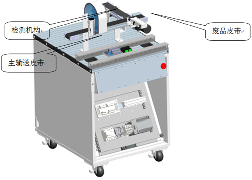 檢測分揀工作站主要由工作實訓平臺、龍門檢測機構(gòu)、物料傳輸皮帶、不合格品處置機構(gòu)、 PLC 主機、掛板控制板等組成。