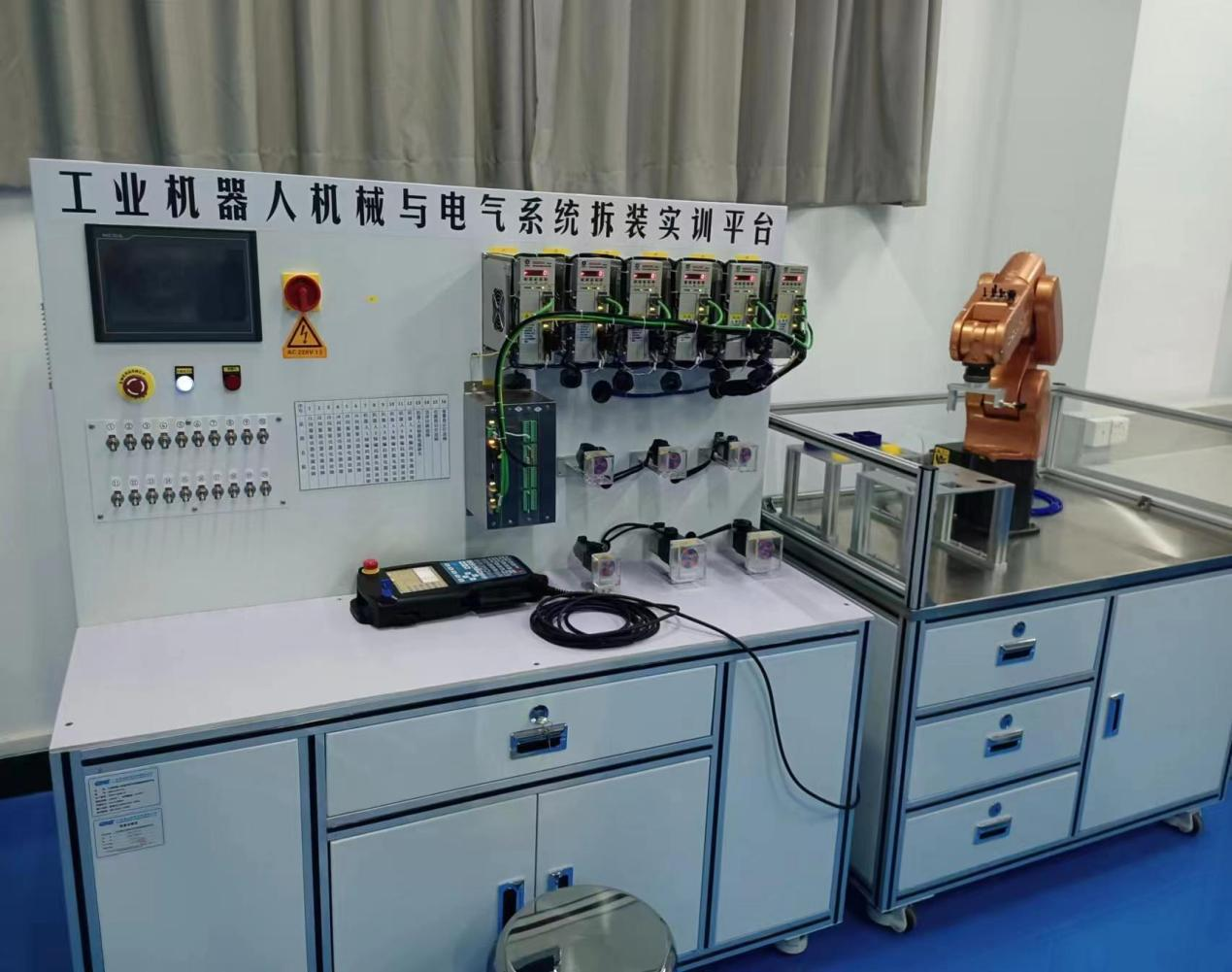 實驗設(shè)備可反復(fù)實訓(xùn)使用,將機器人的電氣控制柜進行整體拆除做成一個獨立的工業(yè)機器人電氣拆裝系統(tǒng)模塊。具體做法為鋁型材搭建,兩側(cè)和底部鈑金封板,為伺服電機、示教器、功能模塊等部件的安裝提供標準的安裝接口,預(yù)留有標準電氣接口安裝位置,可根據(jù)模塊的使用情況進行功能的擴展,同時為各功能模塊提供穩(wěn)定的電源。