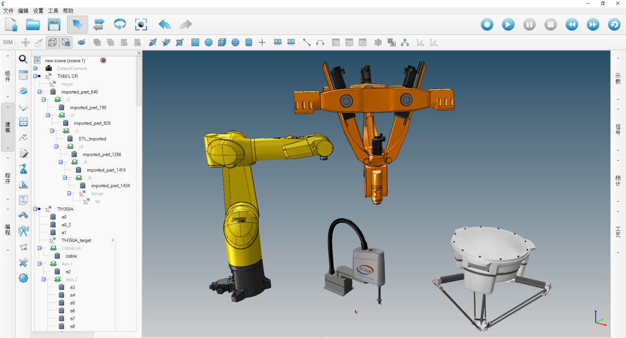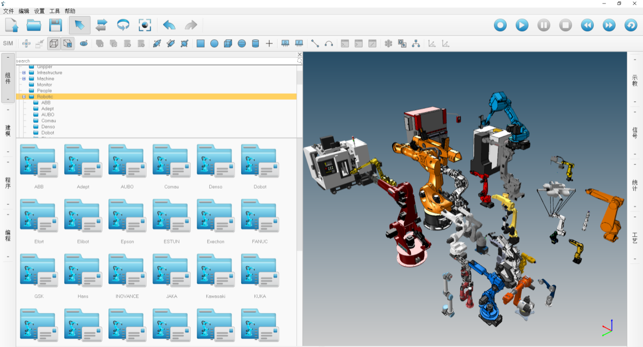 ( 1 )仿真系統(tǒng)支持 50 種以上的各品 牌機器人模型和大量生產(chǎn)線組件庫;