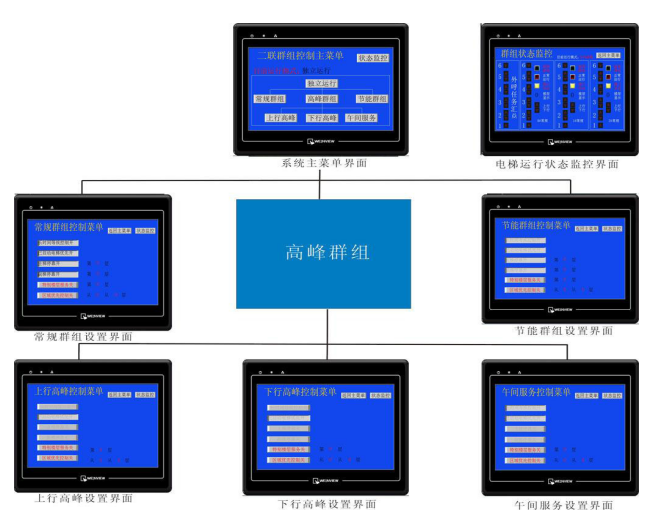 1.狀態(tài)監(jiān)控,該功能可監(jiān)視主、副梯的群組運行狀態(tài)、故障報警狀態(tài)、轎箱門狀態(tài)、電梯運行方向、電梯轎箱位置、電梯的優(yōu)先調(diào)度、電梯所需響應(yīng)的外呼召喚以及總體外呼任務(wù)設(shè)置。
