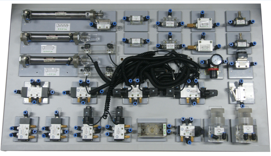 本實(shí)驗(yàn)臺(tái)設(shè)計(jì)有專用的原件配置板,每個(gè)元件都有一個(gè)固定的放置位置。有利于實(shí)驗(yàn)器件的管理。配備了:空氣過(guò)濾、減壓、油霧器三聯(lián)件,減壓閥,手動(dòng)換向閥,電磁換向閥,氣控?fù)Q向閥,行程閥,單向閥,節(jié)流閥、單向節(jié)流閥、快速排氣閥,或門型梭閥,單作用氣缸,雙作用氣缸、旋轉(zhuǎn)氣缸.....等常用的氣動(dòng)元件。(具體配置詳見清單)