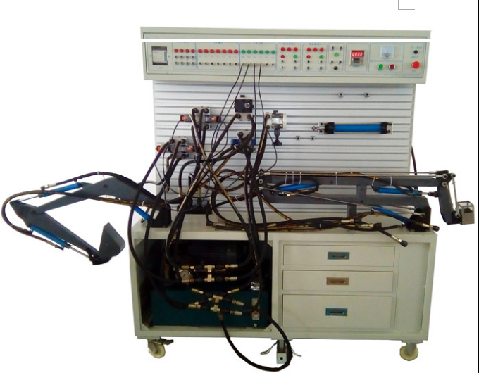 該實驗臺根據(jù)工廠實際應(yīng)用條件而設(shè)計,所有液壓元件均耐高壓,采用北京華德液壓元件和獨特的模塊化設(shè)計,構(gòu)成插接方便的液壓回路實驗系統(tǒng)。學(xué)生可根據(jù)自己設(shè)計思路搭建不同功能的液壓回路系統(tǒng),從而對液壓系統(tǒng)的組成、液壓系統(tǒng)的工作原理、壓差與流量 的特性、主要元部件的靜、動態(tài)特性測試以及各種液壓回路的應(yīng)用有了更深刻的認識,進而提高了學(xué)生對液壓系統(tǒng)的動手能力和設(shè)計水平。