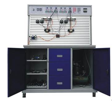 氣動PLC控制實驗臺主要由實驗桌及實驗支架、氣動元器件、電氣控制器件等組成。
