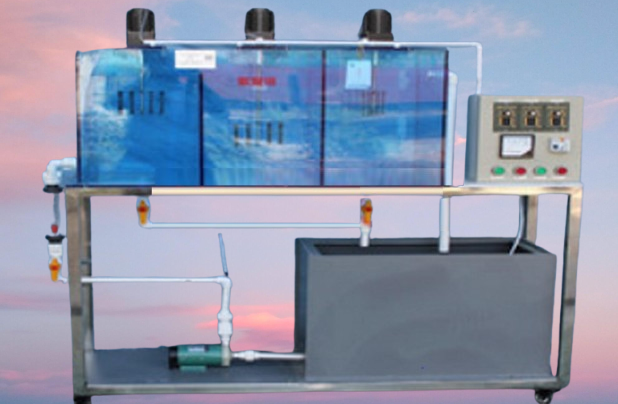 給水處理中澄清工藝通常包括混凝、沉淀和過(guò)濾,處理對(duì)象主要是水中懸浮物和膠體雜質(zhì)。原水加藥后,經(jīng)混凝使水中懸浮物和膠體形成大顆粒絮凝體,而后通過(guò)沉淀池進(jìn)行重力分離。機(jī)械反應(yīng)斜板沉淀池就是混凝、絮凝沉淀兩種功能的凈水構(gòu)筑物。本模型就是展示絮凝反應(yīng)池和斜板沉淀池內(nèi)部構(gòu)造的實(shí)驗(yàn)裝置。希望達(dá)到以下目的: