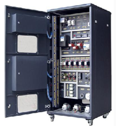 該種維修電工教學(xué)柜式實訓(xùn)考核裝置,包括有柜架、觀察窗、儀表操作盤、電氣系統(tǒng)、電機機組組成,所說的電氣系統(tǒng)由多個部分前后面板縱向展開排列,包括觸摸屏部分、 PLC 主機部分、變頻器部分、電力電子部分、直流電源部分、電力拖動與繼電控制部分,電機軸功率、力矩、轉(zhuǎn)速測量部分,交直流電壓、電流,單三相交流電能、交流功率、功率因數(shù)測量部分等組成。