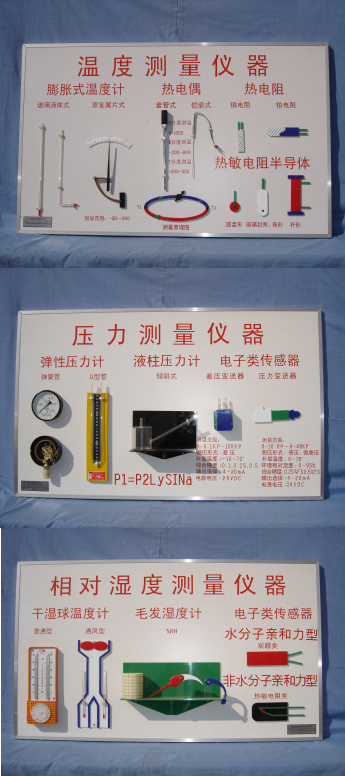 熱工類測量儀器示教板,分為溫度測量示教板;壓力測量示教板;相對濕度測量示教板;流量測量示教板。