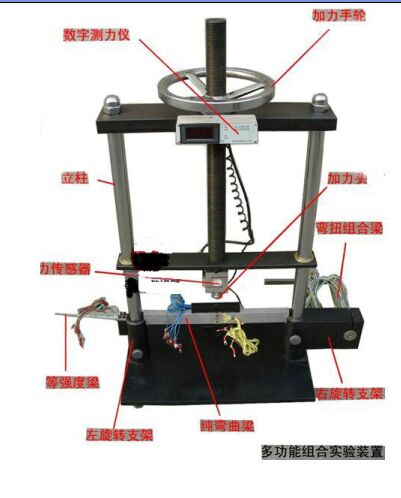 7、多功能組合實驗裝置由立柱、底盤、加力手輪、力傳感器、數(shù)字測力儀、加力頭、左右旋轉(zhuǎn)支架(裝有定位鎖緊螺母),等強度試驗梁,純彎曲實驗梁,彎扭組合實驗梁,溫度補償塊等組成。