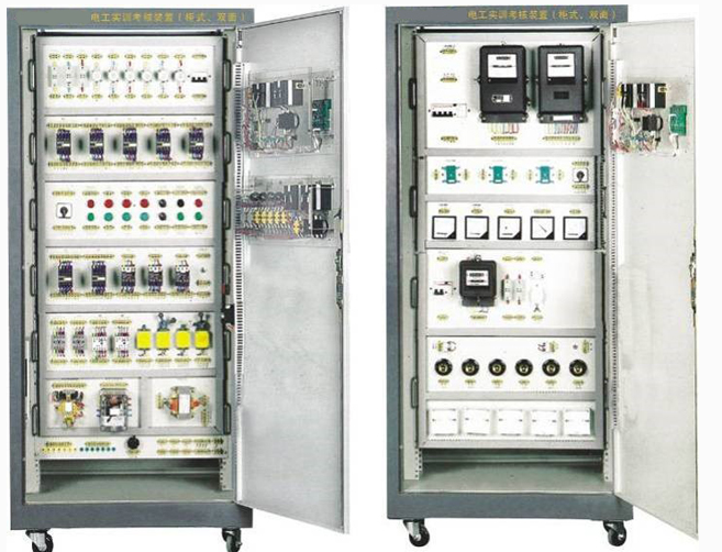 電機電控配線安裝實訓(xùn)柜以標(biāo)準(zhǔn)的配電柜為主柜,合理利用柜體的雙面空間,科學(xué)地布置電器及配套實驗器材,面板裝有電流、電壓表及操作按鈕,內(nèi)部裝有完成電動機控制電路所需要的各種低壓電器,如漏電斷路器、熔斷絲、電流互感器、接觸器、中間繼電器、熱繼電器、行程開關(guān)按鈕、信號燈、轉(zhuǎn)換開關(guān)、電壓表、電流表等,為了延長電器使用壽命,各電器的接點都先與接線端子相連,再在端子上接線操作,以求經(jīng)久耐用,能滿足照明電路和電動機控制電路的實訓(xùn)項目。