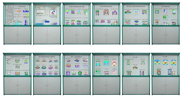 陳列柜共分十二個柜和一個電腦控制臺,進(jìn)行多媒體聲控同步解說演示。由 PC 電腦軟件控制順序或任選播放圖像或三維動畫同步模型演示模具功能原理。