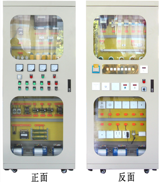 1、本裝置采用正反二面開(kāi)門的離墻式威圖電氣控制柜,且正反面同時(shí)都可以操作,柜體中寬度能保證兩個(gè)學(xué)生同時(shí)合作接線實(shí)訓(xùn)的需要,其外形尺寸寬×厚×高分別為: 800 × 600 × 2000 mm 。柜體采用厚度為 1.5 以上的優(yōu)質(zhì)鋼板,柜門采用厚度為國(guó)標(biāo) 2.0 以上的優(yōu)質(zhì)鋼板并安裝四塊大的玻璃,學(xué)生能通過(guò)玻璃看清柜內(nèi)各元器件及相應(yīng)的動(dòng)作,金屬表面噴塑,柜體中間有二塊優(yōu)質(zhì)環(huán)氧樹(shù)脂絕緣板和相應(yīng)的支架系統(tǒng)隔離正反兩個(gè)柜體,安裝板上安裝智能建筑電氣控制線路各實(shí)訓(xùn)考核模塊。各元器件所有的接線端都連接至相應(yīng)的專用實(shí)訓(xùn)接線端子上,每個(gè)接線端上都套有用電腦打印接線端名稱及編號(hào)的套管,并且更換方便。被控制電機(jī)安裝于電氣控制柜內(nèi)。