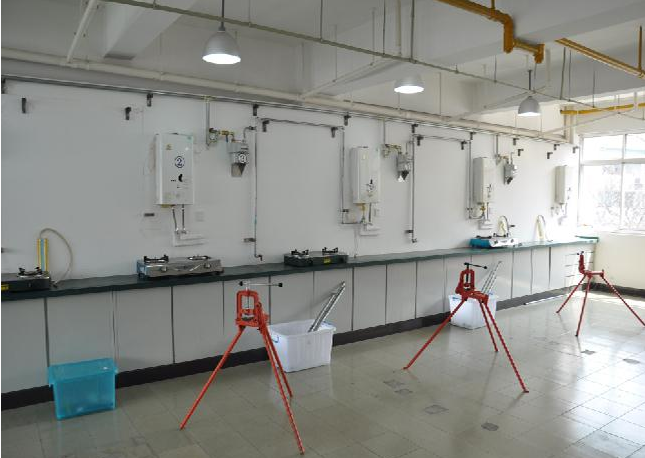 該裝置由灶具、軟管、燃?xì)獗?、表前閥、表后閥、燃?xì)夤艿篮筒讳P鋼安裝平臺(tái)框架等組成,包含了三通、彎頭、直接、球閥、臺(tái)虎鉗、割刀、卷尺、試壓泵、 U 形壓力計(jì)等多種連接配件和工具,整體采用鍍鋅管材,根據(jù)安裝規(guī)范,使用專用工具,可以完成一個(gè)典型的家庭燃?xì)夤苈废到y(tǒng),最后進(jìn)行密封性檢驗(yàn)。