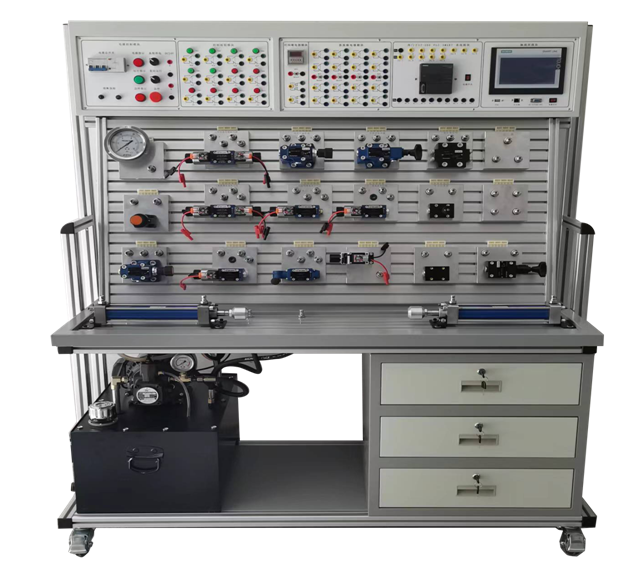 氣動與PLC控制實訓(xùn)裝置是應(yīng)現(xiàn)代液壓氣動專業(yè)教學(xué)實驗要求。根據(jù)《液壓與氣動傳動》,《氣動控制技術(shù)》等通用教材內(nèi)容設(shè)計而成。該系統(tǒng)除了可以進(jìn)行常規(guī)的氣動基本控制回路實驗外,還可以進(jìn)行模擬氣動控制技術(shù)應(yīng)用實驗,氣動技術(shù)課程設(shè)計等。此外,氣動與PLC控制實訓(xùn)裝置采用PLC控制方式。利用PLC控制系統(tǒng)與電腦連接,從學(xué)習(xí)簡單的PLC指令編程,梯形圖編程,深入到PLC控制的應(yīng)用,與計算機(jī)通訊、在線調(diào)試等實驗功能。是氣動技術(shù)和電氣PLC控制技術(shù)的完美結(jié)合。