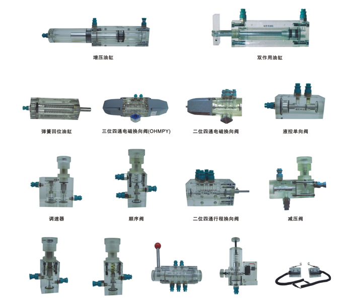4、實(shí)驗(yàn)元件均為透明有機(jī)材料制成,便于了解掌握幾十種常用液壓元件的結(jié)構(gòu),性能及用途。掌握幾十種基本回路的工作原理,實(shí)驗(yàn)組裝回路快捷、方便。