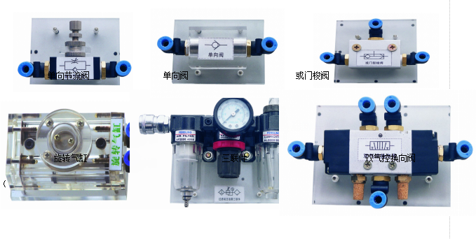 減壓閥,手動(dòng)換向閥,電磁換向閥,氣控?fù)Q向閥,行程閥,單向閥,節(jié)流閥、單向節(jié)流閥、快速排氣閥,或門型梭閥,單作用氣缸,雙作用氣缸、旋轉(zhuǎn)氣缸,行程開(kāi)關(guān)(常閉、常開(kāi))等。