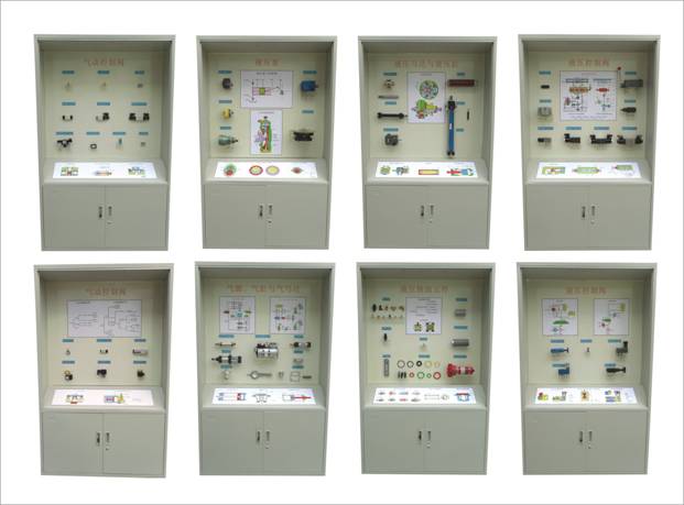 氣動(dòng)液壓示教陳列柜是為了滿足大、中院校的教學(xué)需要,根據(jù)相關(guān)教材編制設(shè)計(jì)的現(xiàn)代教學(xué)設(shè)備,其中主要以實(shí)物或模型以及必要的圖文資料展示氣缸,控制閥,液壓泵,馬達(dá),控制閥等相關(guān)元件的基本類型與基本結(jié)構(gòu)。