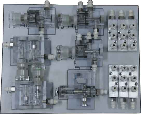 本產(chǎn)品的配有三塊液壓元件固定配置板。每塊元件固定配置板上設計有液壓元件及元件底板位置輪廓圖及液壓元件名稱。各種透明液壓元件(如油缸、閥、壓力表、壓力繼電器等等)均安放在元件固定配置板上的固定位置。防止元件缺失,便于實驗設備的管理。