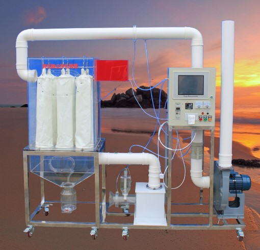 其主要原理是:含塵氣流從進(jìn)氣管進(jìn)入除塵設(shè)備后,從圓筒形濾袋外側(cè)向布袋內(nèi)側(cè)流動,在通過濾料的孔隙時,粉塵被捕集與濾料上,透過濾料的清潔氣體由濾袋上部開口排出。沉積在濾料上的粉塵,可定期由在安裝在布袋開口上方的壓縮空氣噴嘴釋放高壓氣體而造成布袋膨脹、振動而從濾料表面脫落,落入灰斗中。因?yàn)闉V料本身網(wǎng)孔較大,因而新鮮濾料的除塵效率較低,粉塵因截流、慣性碰撞、靜電和擴(kuò)散等作用,逐漸在濾袋表面形成粉塵層,常稱為粉層初層。初層形成后,它成為袋式除塵器的主要過濾層,提高了除塵效率。濾布只不過起著形成粉層初層和支撐它的骨架作用,但隨著粉塵在濾袋上積聚,濾袋兩側(cè)的壓力差增大,會把有些已附在濾料上的細(xì)小粉塵擠壓過去,使除塵效率顯著下降。另外,若除塵器阻力過高,還會使除塵系統(tǒng)的處理氣量顯著下降,影響生產(chǎn)系統(tǒng)的排風(fēng)效果。因此,除塵器阻力達(dá)到一定數(shù)值后,要及時清灰。本設(shè)備可作為布袋除塵凈化實(shí)驗(yàn)原理演示裝置