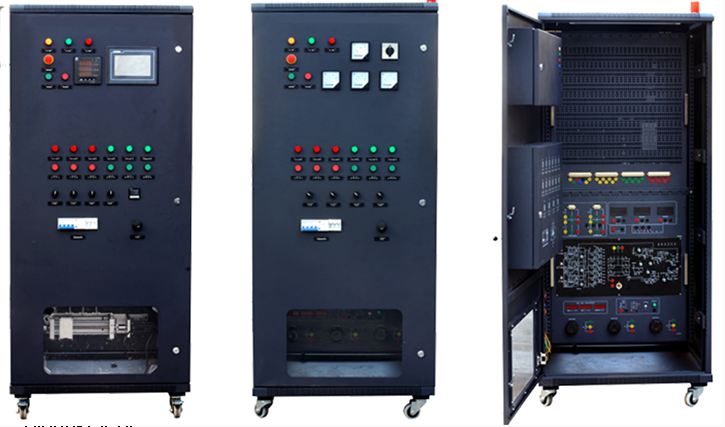 該種維修電工教學(xué)柜式實(shí)訓(xùn)考核裝置,包括有柜架、觀察窗、儀表操作盤、電氣系統(tǒng)、電機(jī)機(jī)組組成,所說的電氣系統(tǒng)由多個(gè)部分前后面板縱向展開排列,包括觸摸屏部分、 PLC 主機(jī)部分、變頻器部分、電力電子部分、直流電源部分、電力拖動(dòng)與繼電控制部分,電機(jī)軸功率、力矩、轉(zhuǎn)速測量部分,交直流電壓、電流,單三相交流電能、交流功率、功率因數(shù)測量部分等組成。