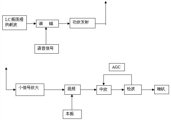 調(diào)幅收發(fā)信機(jī)系統(tǒng)由語音輸入電路、基礎(chǔ)調(diào)幅電路、丙類功率放大器電路、發(fā)射電路、 LC 振蕩器電路(提供載波,頻率可調(diào))組成發(fā)射電路部分;由接收天線、小信號諧振放大器電路、混頻器電路、振蕩器電路(提供本振信號)、中頻放大器電路(含自動增益控制)、大信號檢波電路、功放電路組成接收部分。此部分的中頻在 2.5MHZ (因?yàn)槭歉哳l實(shí)驗(yàn)系統(tǒng),頻率不益太低)