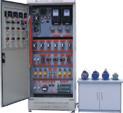 該裝置按標準電氣控制柜設(shè)計制造規(guī)格,充分利用雙面位置,柜內(nèi)裝有完成各種照明電路所需的單相電度表、日光燈、單聯(lián)開關(guān)、插座、感應(yīng)開關(guān)、漏電開關(guān)等,以及電氣控制所需要的多種低壓電器,如漏電斷路器、熔斷器、電流互感器、交流接觸器、時間繼電器、熱繼電器、中間繼電器、行程開關(guān)、按鈕、信號燈、轉(zhuǎn)換開關(guān)、電壓表、電流表、功率表及電度表等,,各電器的接點都與接線端子相連,再由接線端子與被控制電氣連接。