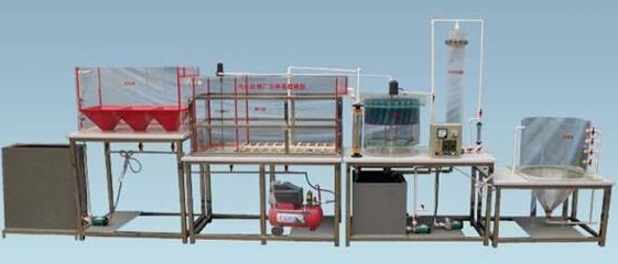 本裝置以現(xiàn)場(chǎng)工程中的小型污水處理廠部分處理系統(tǒng)為原型,其中配置多斗初沉池、曝氣池、二沉池、砂濾裝置及濃縮池等;污水通過(guò)配水箱被提升至初沉池進(jìn)行初級(jí)污泥沉淀,然后進(jìn)至曝氣池進(jìn)行接觸氧曝氣處理,曝氣通過(guò)小型空氣壓縮機(jī),并通過(guò)風(fēng)量計(jì)進(jìn)行對(duì)曝氣量的控制;經(jīng)過(guò)曝氣池的污水再通過(guò)二沉池進(jìn)行沉淀;再進(jìn)入砂濾裝置進(jìn)行過(guò)濾;最后進(jìn)入濃縮池進(jìn)行濃縮處理。學(xué)生通過(guò)對(duì)該污水處理廠立體布置模型系統(tǒng)的學(xué)習(xí),可了解系統(tǒng)中典型污水處理系統(tǒng)的應(yīng)用,掌握各個(gè)系統(tǒng)的工作原理,進(jìn)而具備設(shè)計(jì)污水處理廠各處理系統(tǒng)的能力。